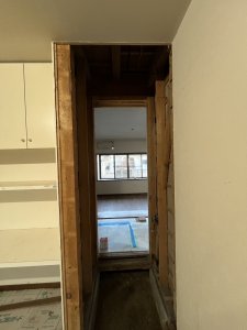 福山市南松永町にてアパート2部屋の改修工事です。 こちらの部屋は、ユニットバスが古くなり、少し劣化していたので新しく取替えます。今、撤去が終わりました。入口周りも造作工事していきます。