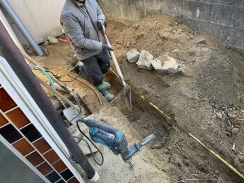 福山市千田町にて、汲み取りトイレから水洗トイレへのリフォーム工事です。 下水道の整備されているエリアのため、配管を埋設して水洗トイレが利用できるように作業中です。