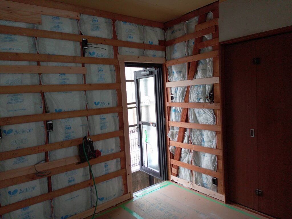 その後、断熱材を入れて壁下地処理を行い、内装クロス工事へ進んでいます。