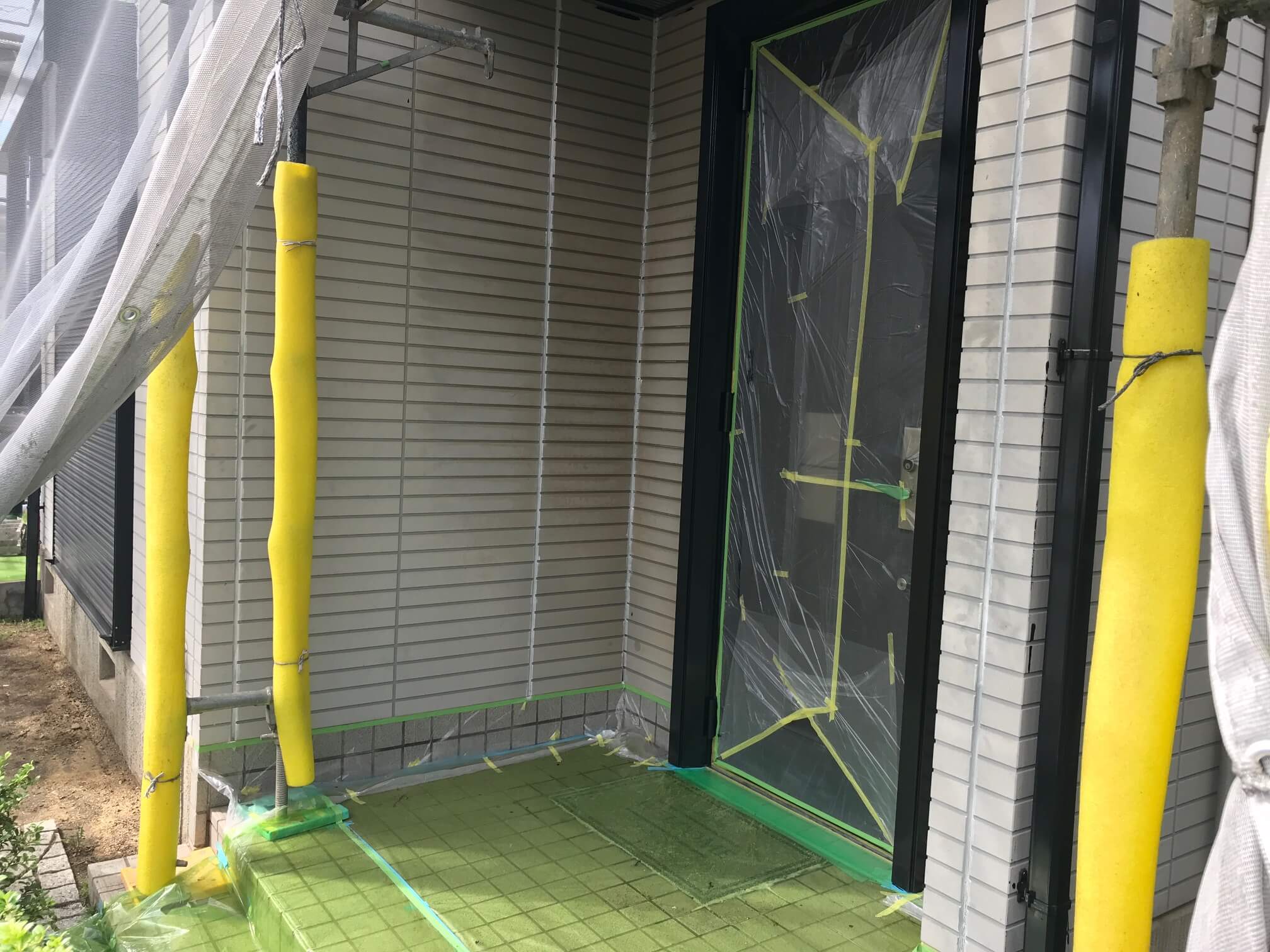 玄関ドア・ポーチ他の養生が終わり、塗装作業に入ります。