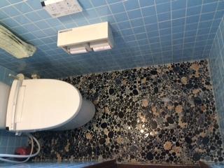 便器を一度はずし、木下地組をした上に仕上げ貼りです。