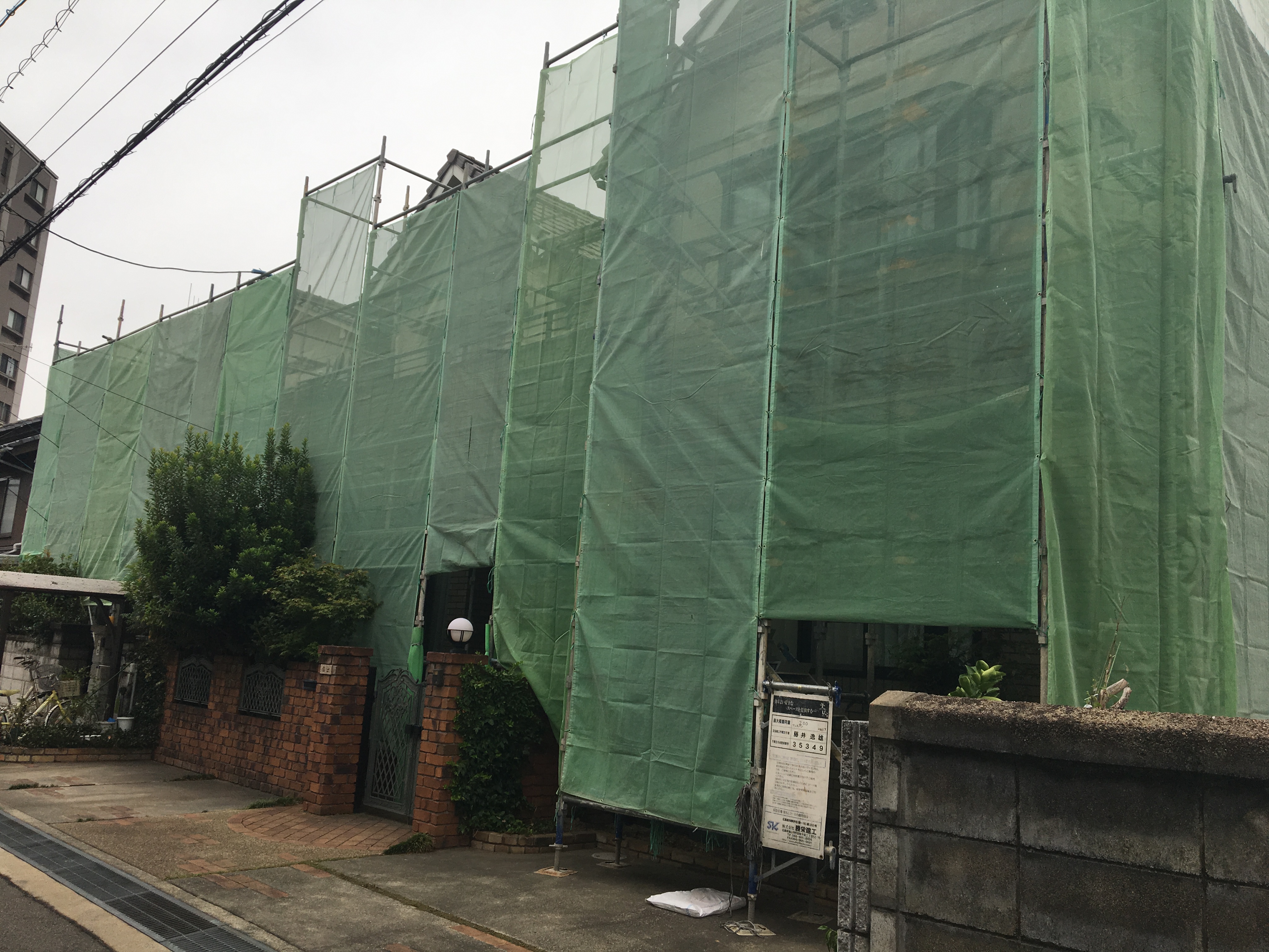 足場を立てた後は、お家の周りをメッシュシートで覆い、塗料の飛び散りなどを防ぎます。