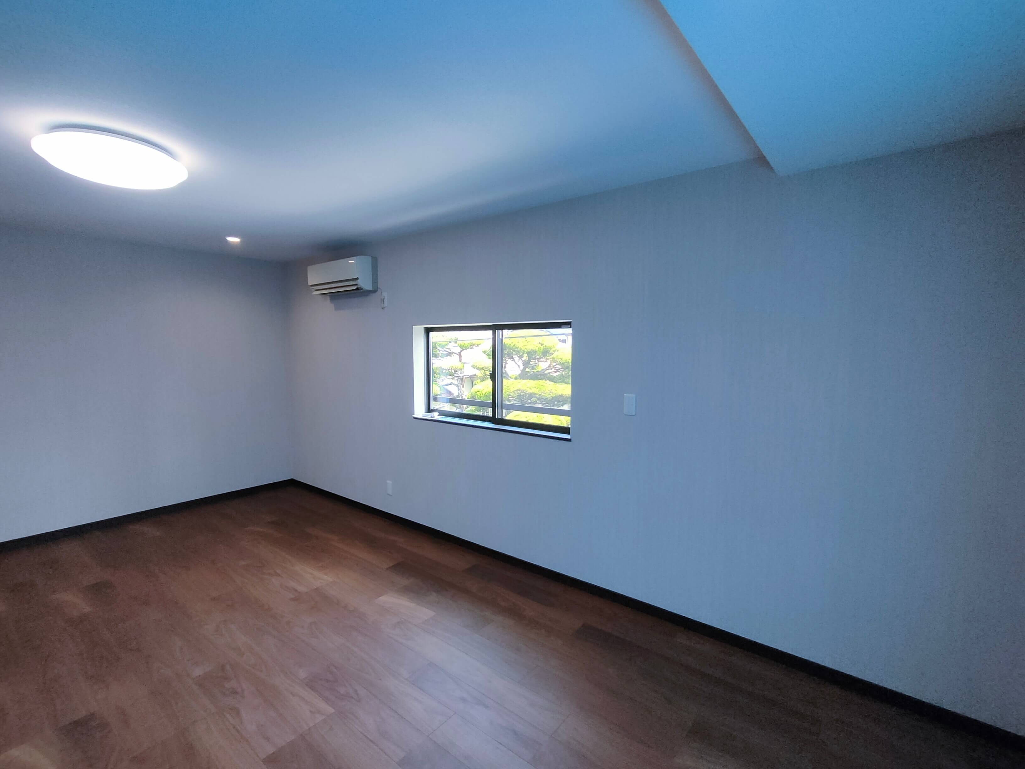 主寝室の床を全体的に改修。廊下の床はまだまだしっかりしていたので廊下の床の高さに合わせバリアフリー化しました。天井高を上げられるだけ上げて開放的空間に。補助灯として、ダウンライトを施工。床に断熱材を施工し、窓をペアガラスの窓に交換したことで断熱性能が上がり、外部からの音の軽減になります。今回、窓の交換は外壁の改修や足場の設置が不要なカバー工法にて施工いたしました。